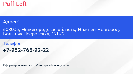 Puff Loft по адресу 603005, Нижегородская область, Нижний Новгород, Большая Покровская, 12Б/2 в дальнейшем Организация, размещена в следующих категориях: