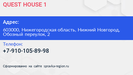 QUEST HOUSE#1 по адресу 603000, Нижегородская область, Нижний Новгород, Обозный переулок, 2 в дальнейшем Организация, размещена в следующих категориях: