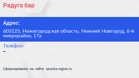 Радуга, бар по адресу 603123, Нижегородская область, Нижний Новгород, 6-й микрорайон, 17а в дальнейшем Организация, размещена в следующих категориях: