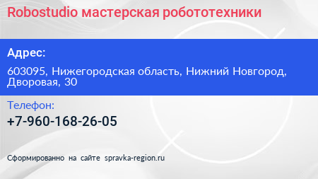 Robostudio, мастерская робототехники по адресу 603095, Нижегородская область, Нижний Новгород, Дворовая, 30 в дальнейшем Организация, размещена в следующих категориях: