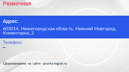 Рюмочная по адресу 603014, Нижегородская область, Нижний Новгород, Коминтерна, 2 в дальнейшем Организация, размещена в следующих категориях: