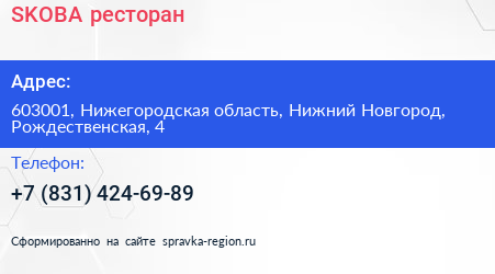 SKOBA, ресторан по адресу 603001, Нижегородская область, Нижний Новгород, Рождественская, 4 в дальнейшем Организация, размещена в следующих категориях: