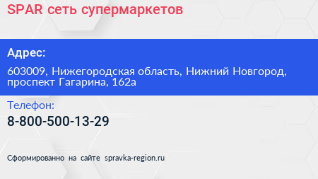 SPAR, сеть супермаркетов по адресу 603009, Нижегородская область, Нижний Новгород, проспект Гагарина, 162а в дальнейшем Организация, размещена в следующих категориях: