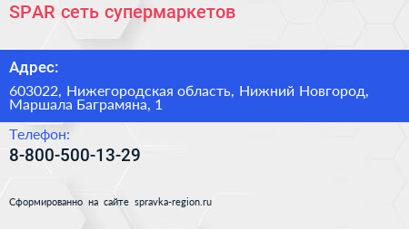 SPAR, сеть супермаркетов по адресу 603022, Нижегородская область, Нижний Новгород, Маршала Баграмяна, 1 в дальнейшем Организация, размещена в следующих категориях: