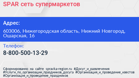 SPAR, сеть супермаркетов по адресу 603006, Нижегородская область, Нижний Новгород, Ошарская, 16 в дальнейшем Организация, размещена в следующих категориях: