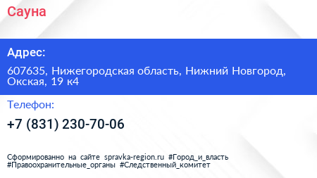 Сауна по адресу 607635, Нижегородская область, Нижний Новгород, Окская, 19 к4 в дальнейшем Организация, размещена в следующих категориях: