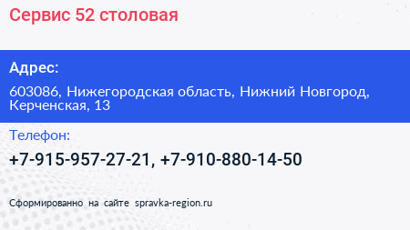 Сервис 52, столовая по адресу 603086, Нижегородская область, Нижний Новгород, Керченская, 13 в дальнейшем Организация, размещена в следующих категориях: