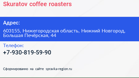 Skuratov, coffee roasters по адресу 603155, Нижегородская область, Нижний Новгород, Большая Печёрская, 44 в дальнейшем Организация, размещена в следующих категориях:
