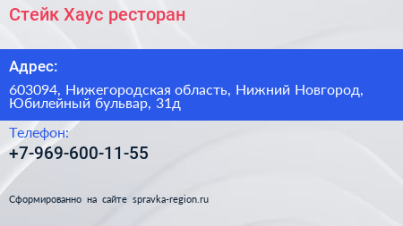 Стейк-Хаус, ресторан по адресу 603094, Нижегородская область, Нижний Новгород, Юбилейный бульвар, 31д в дальнейшем Организация, размещена в следующих категориях: