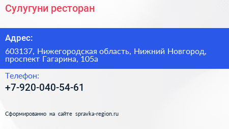 Сулугуни, ресторан по адресу 603137, Нижегородская область, Нижний Новгород, проспект Гагарина, 105а в дальнейшем Организация, размещена в следующих категориях: