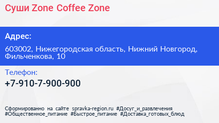 Суши Zone & Coffee Zone по адресу 603002, Нижегородская область, Нижний Новгород, Фильченкова, 10 в дальнейшем Организация, размещена в следующих категориях: