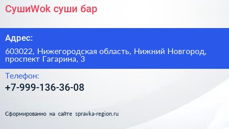 СушиWok, суши-бар по адресу 603022, Нижегородская область, Нижний Новгород, проспект Гагарина, 3 в дальнейшем Организация, размещена в следующих категориях: