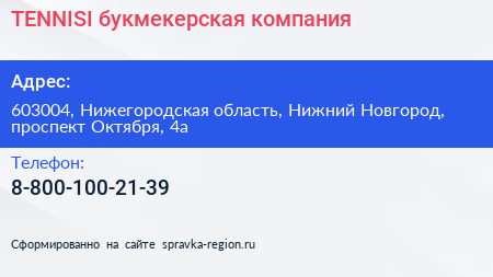 TENNISI, букмекерская компания по адресу 603004, Нижегородская область, Нижний Новгород, проспект Октября, 4а в дальнейшем Организация, размещена в следующих категориях: