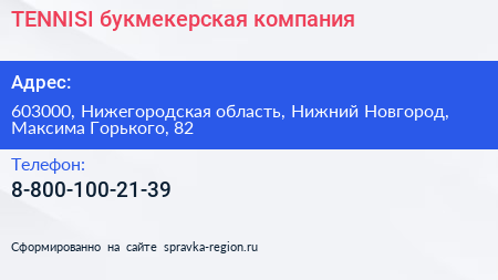 TENNISI, букмекерская компания по адресу 603000, Нижегородская область, Нижний Новгород, Максима Горького, 82 в дальнейшем Организация, размещена в следующих категориях: