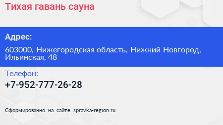 Тихая гавань, сауна по адресу 603000, Нижегородская область, Нижний Новгород, Ильинская, 48 в дальнейшем Организация, размещена в следующих категориях: