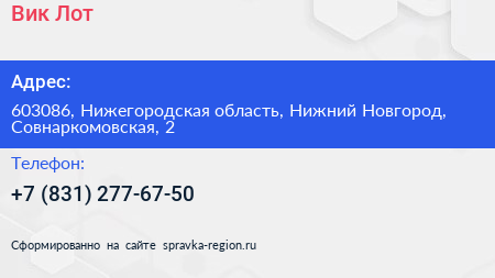 Вик-Лот по адресу 603086, Нижегородская область, Нижний Новгород, Совнаркомовская, 2 в дальнейшем Организация, размещена в следующих категориях: