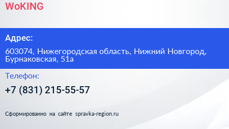 WoKING по адресу 603074, Нижегородская область, Нижний Новгород, Бурнаковская, 51а в дальнейшем Организация, размещена в следующих категориях: