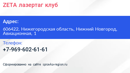ZETA, лазертаг-клуб по адресу 606422, Нижегородская область, Нижний Новгород, Авиационная, 1 в дальнейшем Организация, размещена в следующих категориях: