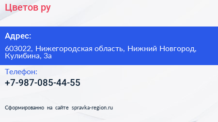 Цветов.ру по адресу 603022, Нижегородская область, Нижний Новгород, Кулибина, 3а в дальнейшем Организация, размещена в следующих категориях: