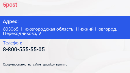5post по адресу 603065, Нижегородская область, Нижний Новгород, Переходникова, 9 в дальнейшем Организация, размещена в следующих категориях: