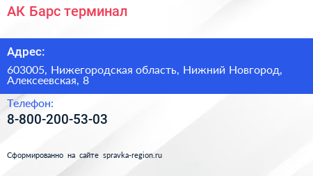АК Барс, терминал по адресу 603005, Нижегородская область, Нижний Новгород, Алексеевская, 8 в дальнейшем Организация, размещена в следующих категориях: