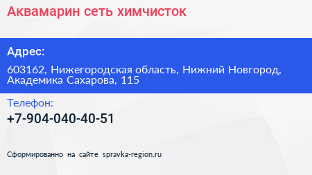 Аквамарин, сеть химчисток по адресу 603162, Нижегородская область, Нижний Новгород, Академика Сахарова, 115 в дальнейшем Организация, размещена в следующих категориях: