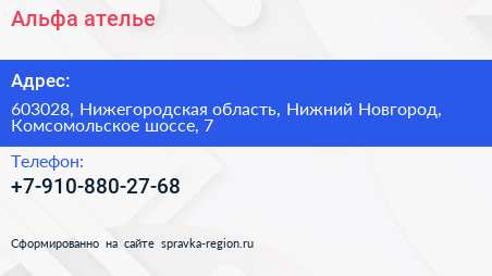 Альфа, ателье по адресу 603028, Нижегородская область, Нижний Новгород, Комсомольское шоссе, 7 в дальнейшем Организация, размещена в следующих категориях: