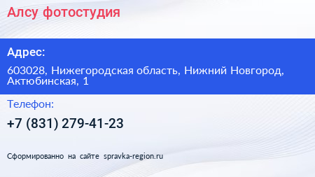 Алсу, фотостудия по адресу 603028, Нижегородская область, Нижний Новгород, Актюбинская, 1 в дальнейшем Организация, размещена в следующих категориях: