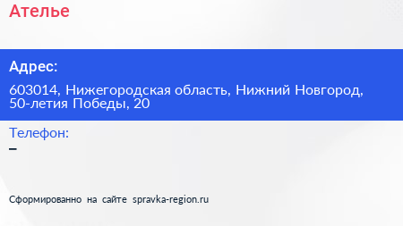 Ателье по адресу 603014, Нижегородская область, Нижний Новгород, 50-летия Победы, 20 в дальнейшем Организация, размещена в следующих категориях: