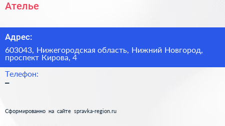 Ателье по адресу 603043, Нижегородская область, Нижний Новгород, проспект Кирова, 4 в дальнейшем Организация, размещена в следующих категориях:
