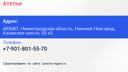 Ателье по адресу 603087, Нижегородская область, Нижний Новгород, Казанское шоссе, 10 к3 в дальнейшем Организация, размещена в следующих категориях: