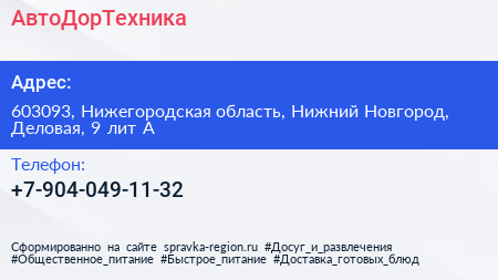 АвтоДорТехника по адресу 603093, Нижегородская область, Нижний Новгород, Деловая, 9 лит А в дальнейшем Организация, размещена в следующих категориях: