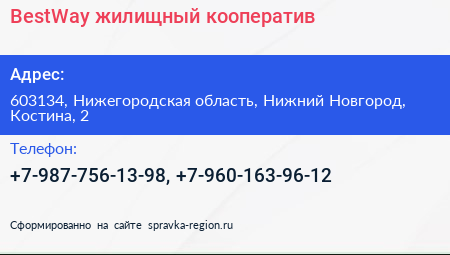 BestWay, жилищный кооператив по адресу 603134, Нижегородская область, Нижний Новгород, Костина, 2 в дальнейшем Организация, размещена в следующих категориях: