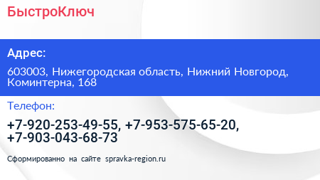 БыстроКлюч по адресу 603003, Нижегородская область, Нижний Новгород, Коминтерна, 168 в дальнейшем Организация, размещена в следующих категориях: