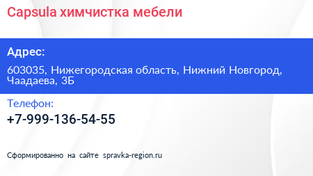 Capsula, химчистка мебели по адресу 603035, Нижегородская область, Нижний Новгород, Чаадаева, 3Б в дальнейшем Организация, размещена в следующих категориях: