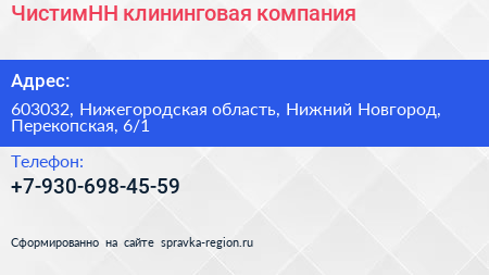 ЧистимНН, клининговая компания по адресу 603032, Нижегородская область, Нижний Новгород, Перекопская, 6/1 в дальнейшем Организация, размещена в следующих категориях: