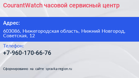 CourantWatch, часовой сервисный центр по адресу 603086, Нижегородская область, Нижний Новгород, Советская, 12 в дальнейшем Организация, размещена в следующих категориях:
