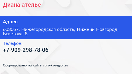 Диана, ателье по адресу 603057, Нижегородская область, Нижний Новгород, Бекетова, 8 в дальнейшем Организация, размещена в следующих категориях: