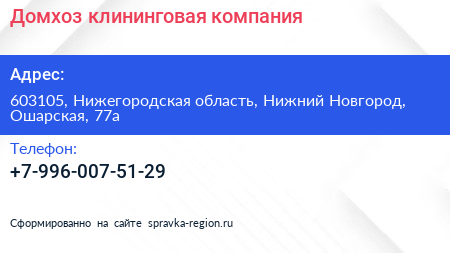Домхоз, клининговая компания по адресу 603105, Нижегородская область, Нижний Новгород, Ошарская, 77а в дальнейшем Организация, размещена в следующих категориях:
