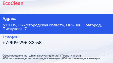 EcoClean по адресу 603005, Нижегородская область, Нижний Новгород, Пискунова, 7 в дальнейшем Организация, размещена в следующих категориях: