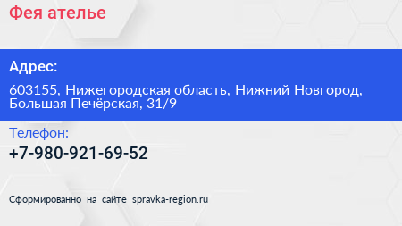 Фея, ателье по адресу 603155, Нижегородская область, Нижний Новгород, Большая Печёрская, 31/9 в дальнейшем Организация, размещена в следующих категориях: