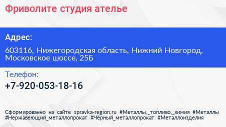 Фриволите, студия-ателье по адресу 603116, Нижегородская область, Нижний Новгород, Московское шоссе, 25Б в дальнейшем Организация, размещена в следующих категориях: