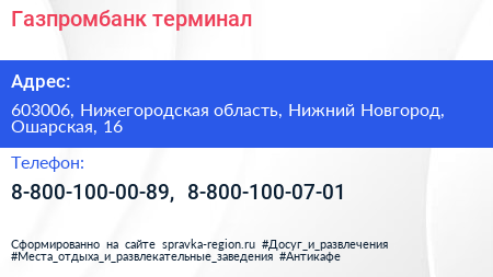 Газпромбанк, терминал по адресу 603006, Нижегородская область, Нижний Новгород, Ошарская, 16 в дальнейшем Организация, размещена в следующих категориях: