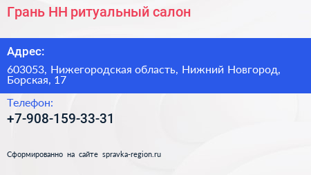 Грань-НН, ритуальный салон по адресу 603053, Нижегородская область, Нижний Новгород, Борская, 17 в дальнейшем Организация, размещена в следующих категориях: