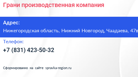 Грани, производственная компания по адресу Нижегородская область, Нижний Новгород, Чаадаева, 47в в дальнейшем Организация, размещена в следующих категориях: