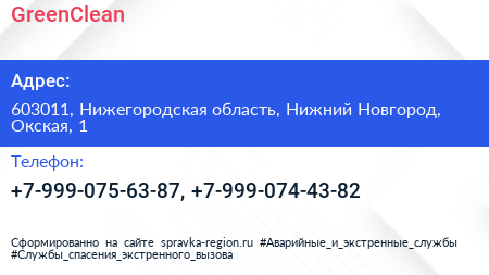 GreenClean по адресу 603011, Нижегородская область, Нижний Новгород, Окская, 1 в дальнейшем Организация, размещена в следующих категориях: