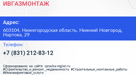 ИВГАЗМОНТАЖ по адресу 603104, Нижегородская область, Нижний Новгород, Нартова, 29 в дальнейшем Организация, размещена в следующих категориях: