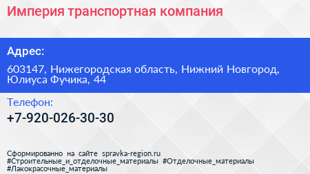 Империя, транспортная компания по адресу 603147, Нижегородская область, Нижний Новгород, Юлиуса Фучика, 44 в дальнейшем Организация, размещена в следующих категориях:
