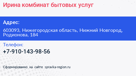 Ирина, комбинат бытовых услуг по адресу 603093, Нижегородская область, Нижний Новгород, Родионова, 184 в дальнейшем Организация, размещена в следующих категориях: