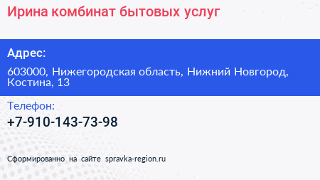 Ирина, комбинат бытовых услуг по адресу 603000, Нижегородская область, Нижний Новгород, Костина, 13 в дальнейшем Организация, размещена в следующих категориях:
